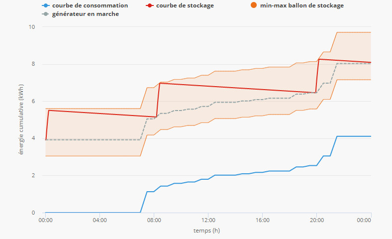Le résultat est un graphique avec les heures de la journée en abscisse et l'énergie disponible dans le ballon de stockage en ordonnée.